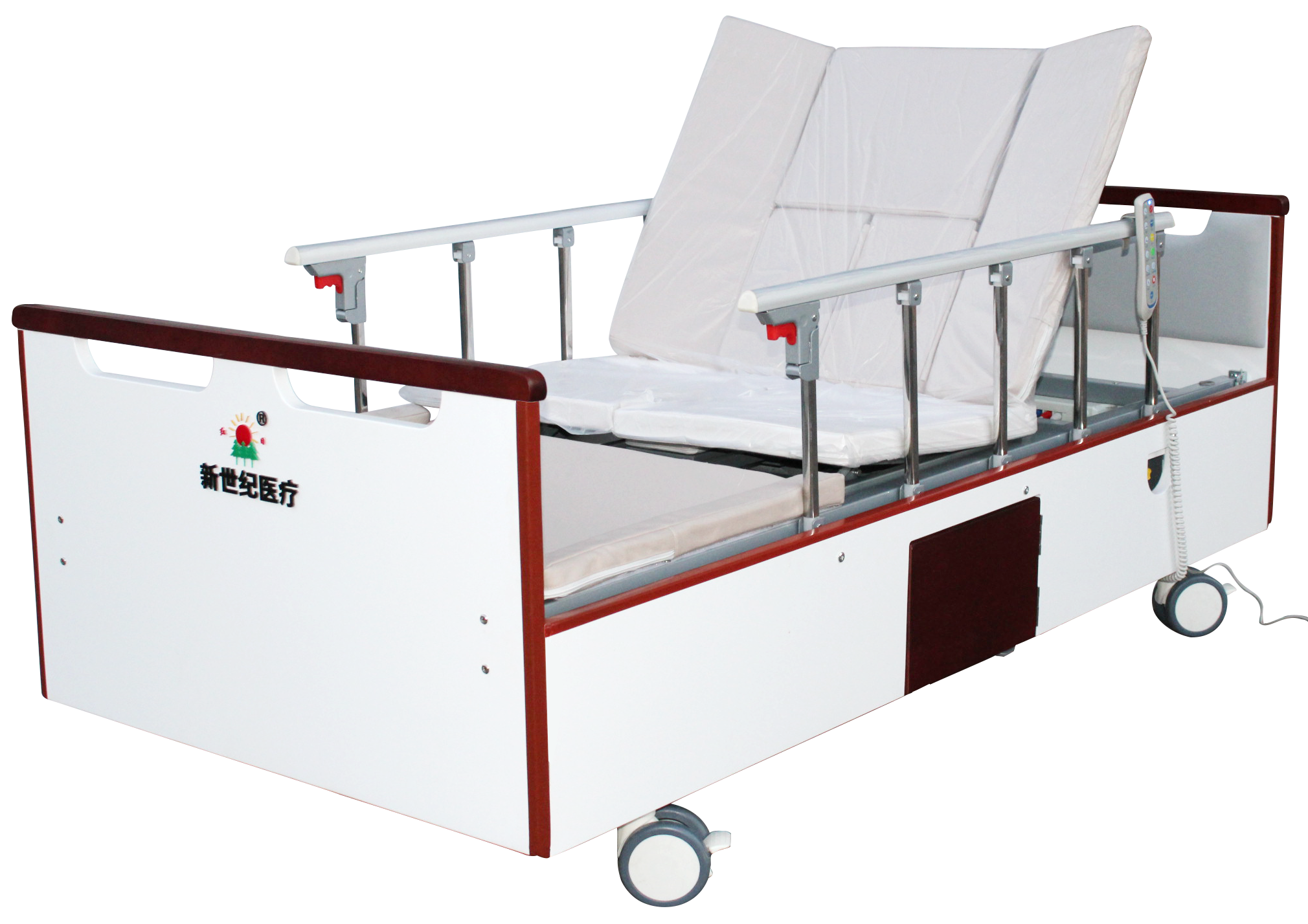 2. 配 置:軟包木床頭 木包圍 5柱護(hù)欄 ABS餐桌板 6cm床墊 雙排輪 智能便口 輸液架